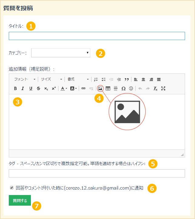 メール通知の設定回答が投稿されると、質問者に通知のメールが送信されるかどうかの設定ができます。メール通知を受けたくいない場合は、チェックをはずしてください。