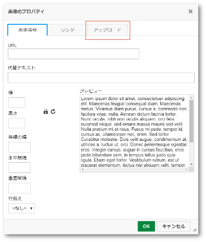 下記のウインドウが開きますのでアップロードタブをクリックしてください。