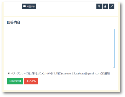 回答投稿フォームが表示されますので、回答内容を入力後に回答を追加ボタンをクリックして投稿してください。